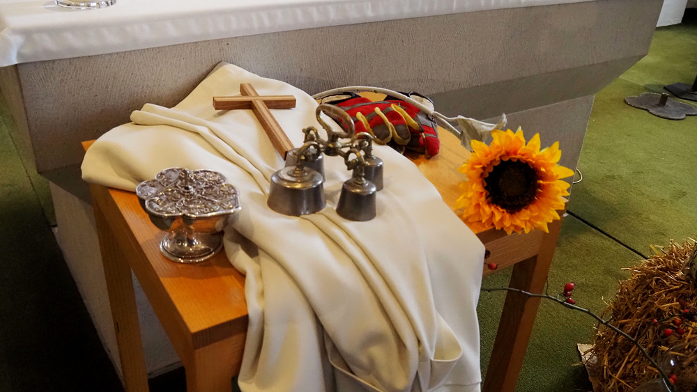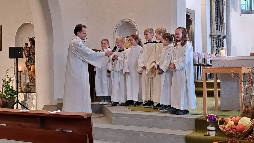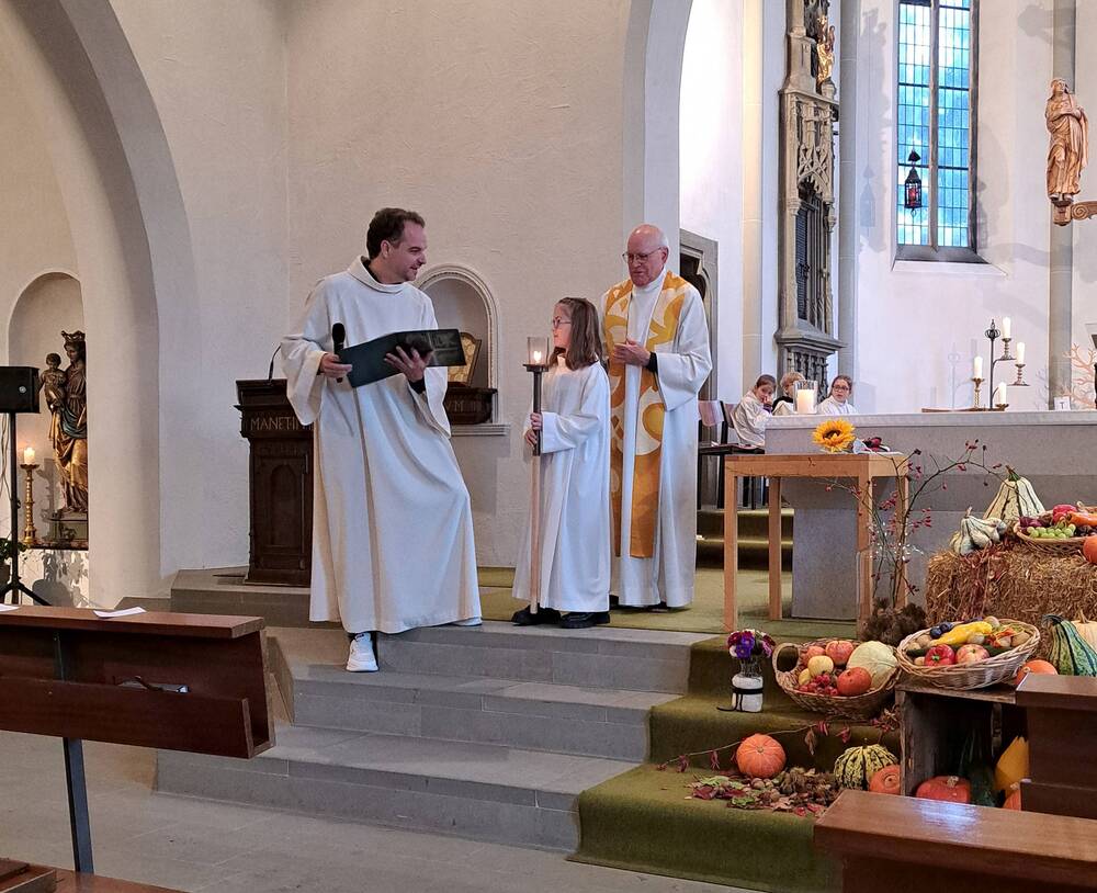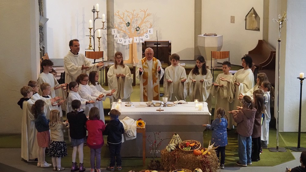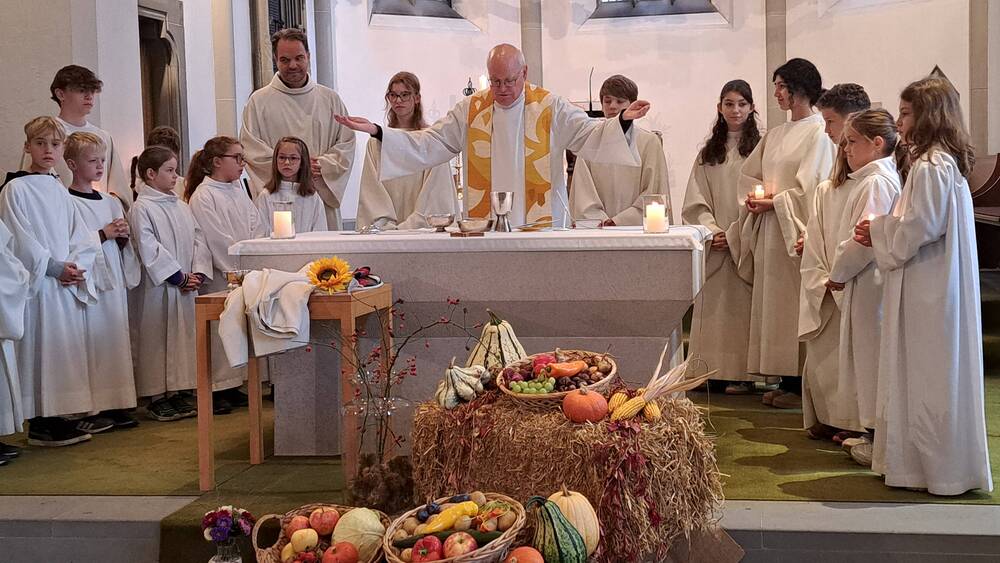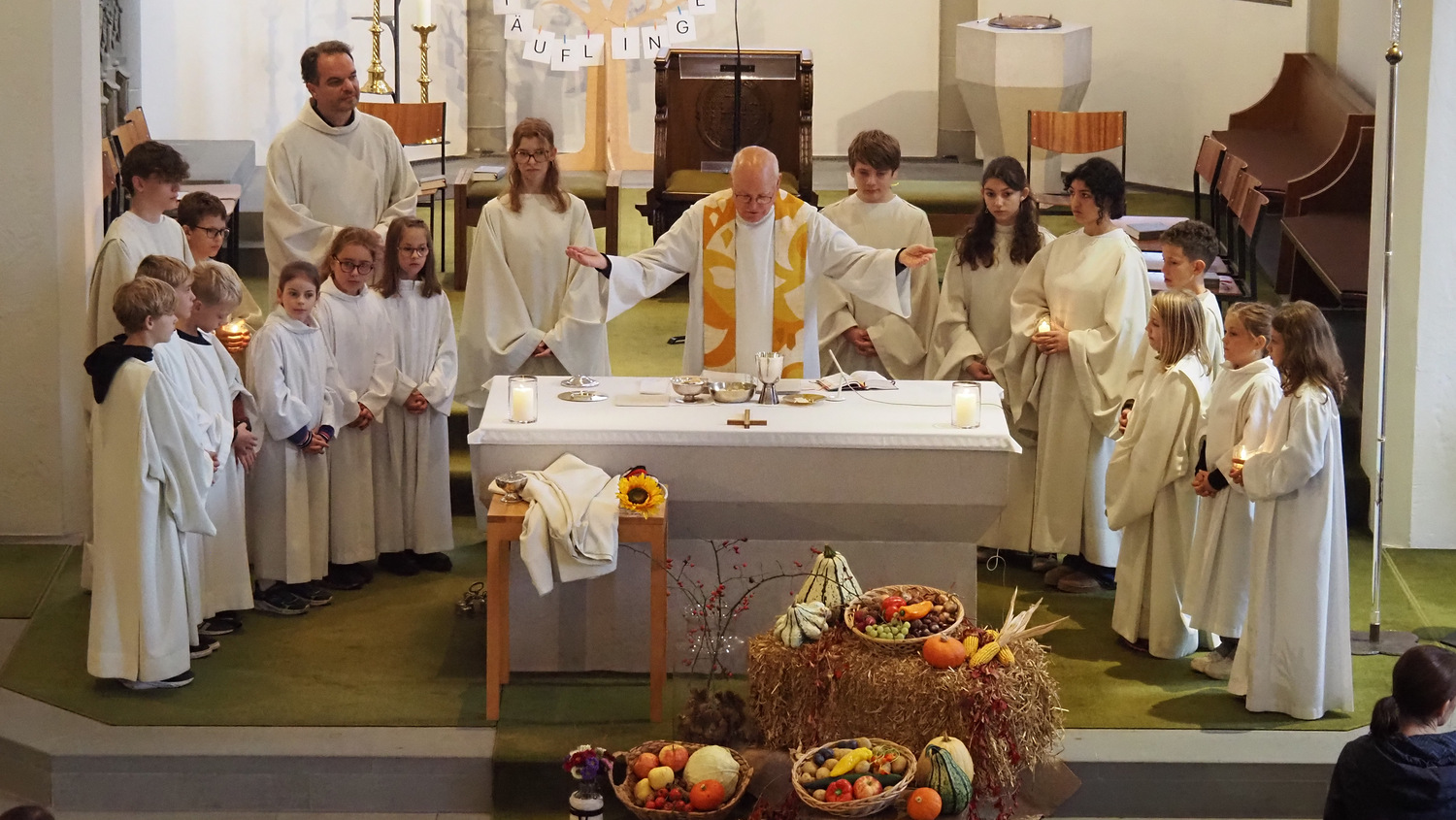 Nach dem Evangelium vom „Dankbaren Samariter“ (Lk 17,11–19) durften die frisch gekürten Minis die Fürbitten vorbringen und besondere Gaben an den Gabentisch bringen: ein Kreuz, eine Sonnenblume, Arbeitshandschuhe, ein Gewand, ein Licht, Weihrauch sowie eine Altarglocke. Die Ministrantenkinder erklärten die einzelnen Symbole. Traditionell segnete Vikar Willi die mitgebrachten Erntekörbchen. Musikalisch begleiteten Valentine und Veronika an zwei Gitarren durch die Feier.