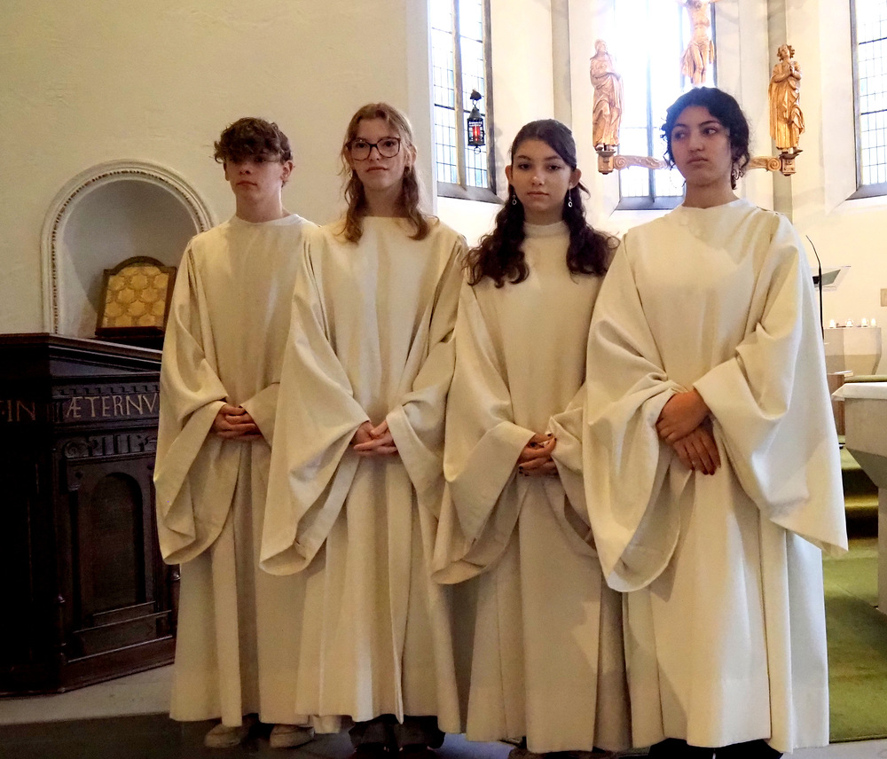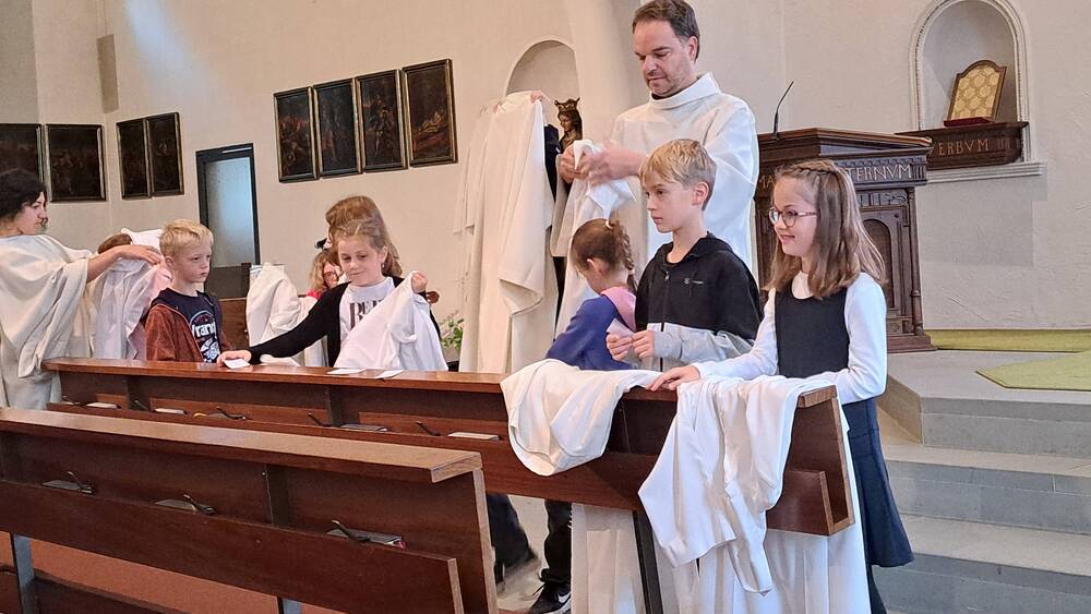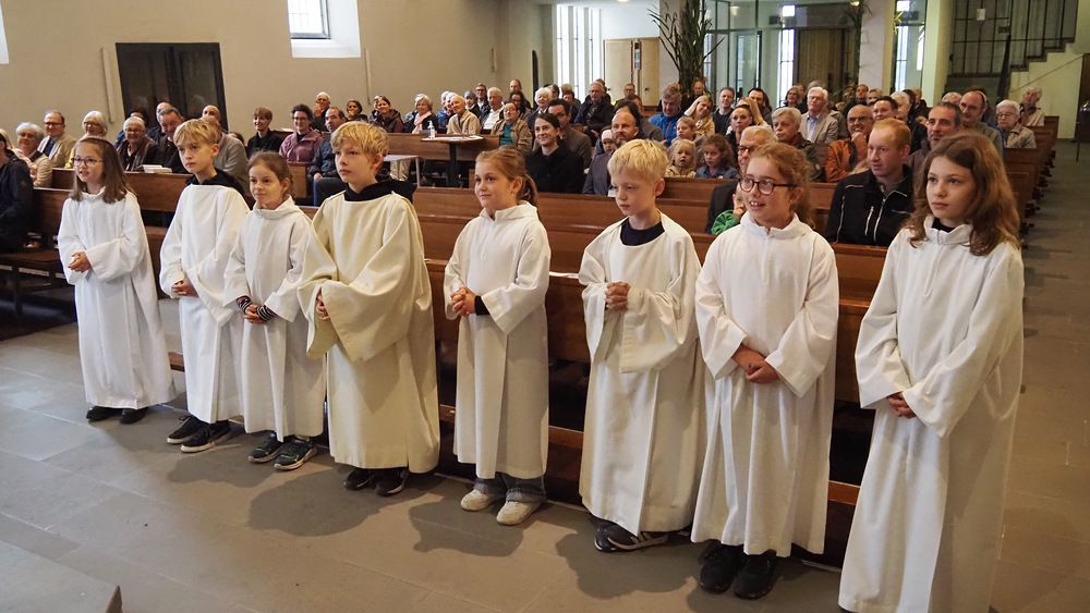 Die Ministrantenaufnahme war ein zentrales Element in dieser Feier und so war die Einkleidung der neuen Minis durch die dienstälteren Ministranten ein starkes und sichtbares Zeichen. Neben den neuen Mini-Leiter:innen durften sich auch die frisch aufgenommenen Minis der Pfarrgemeinde vorstellen. Mit deren Zusage den Dienst gewissenhaft auszuüben und sich gegenseitig zu unterstützen, wurden sie offiziell zum Mini-Dienst bestellt.